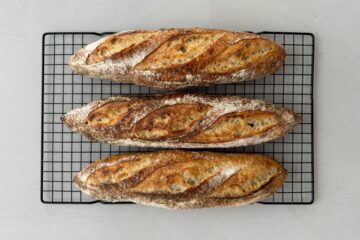 Simone’s Country Loaf is een smaakvol, ambachtelijk zuurdesembrood met een luchtige kruim en heerlijke korst. Door een lange, koele rijping ontwikkelt het een milde en volle smaak. Het proces vraagt aandacht maar is goed te volgen, ook voor thuisbakkers. Dit recept levert twee broden van 600 gram met een heerlijke, natuurlijke smaak.