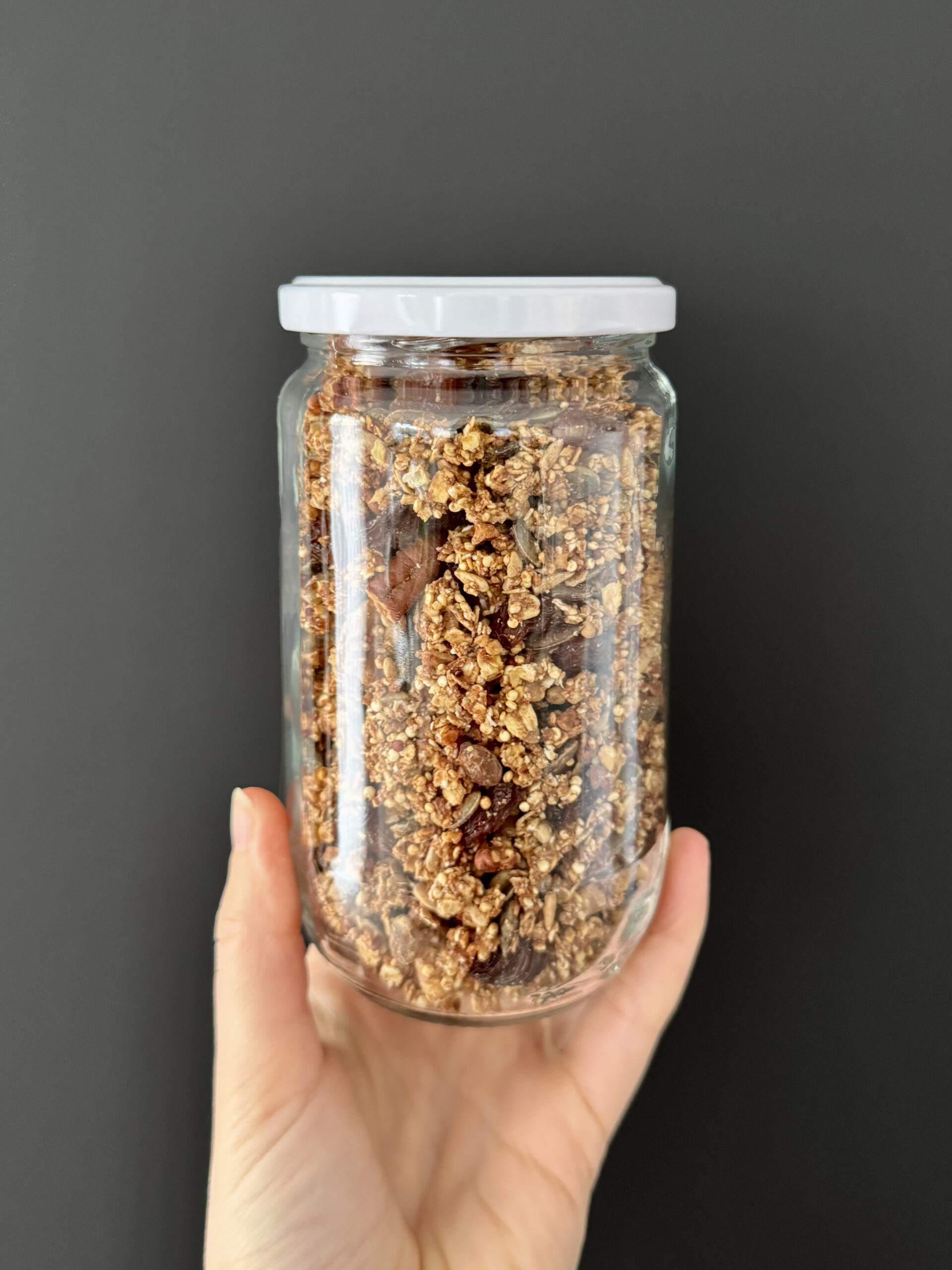 Ik hou van ontbijtjes waar ik blij van word. Die voedzaam zijn, snel klaar en niet te zoet. Deze granola voldoet aan alles. Soms eet ik ‘m puur, met zelfgemaakte Griekse yoghurt en nog wat extra ahornsiroop. Op drukke dagen neem ik een handje mee in een potje. En als ik echt wil genieten, roer ik er wat extra stukjes noot door.