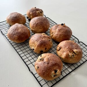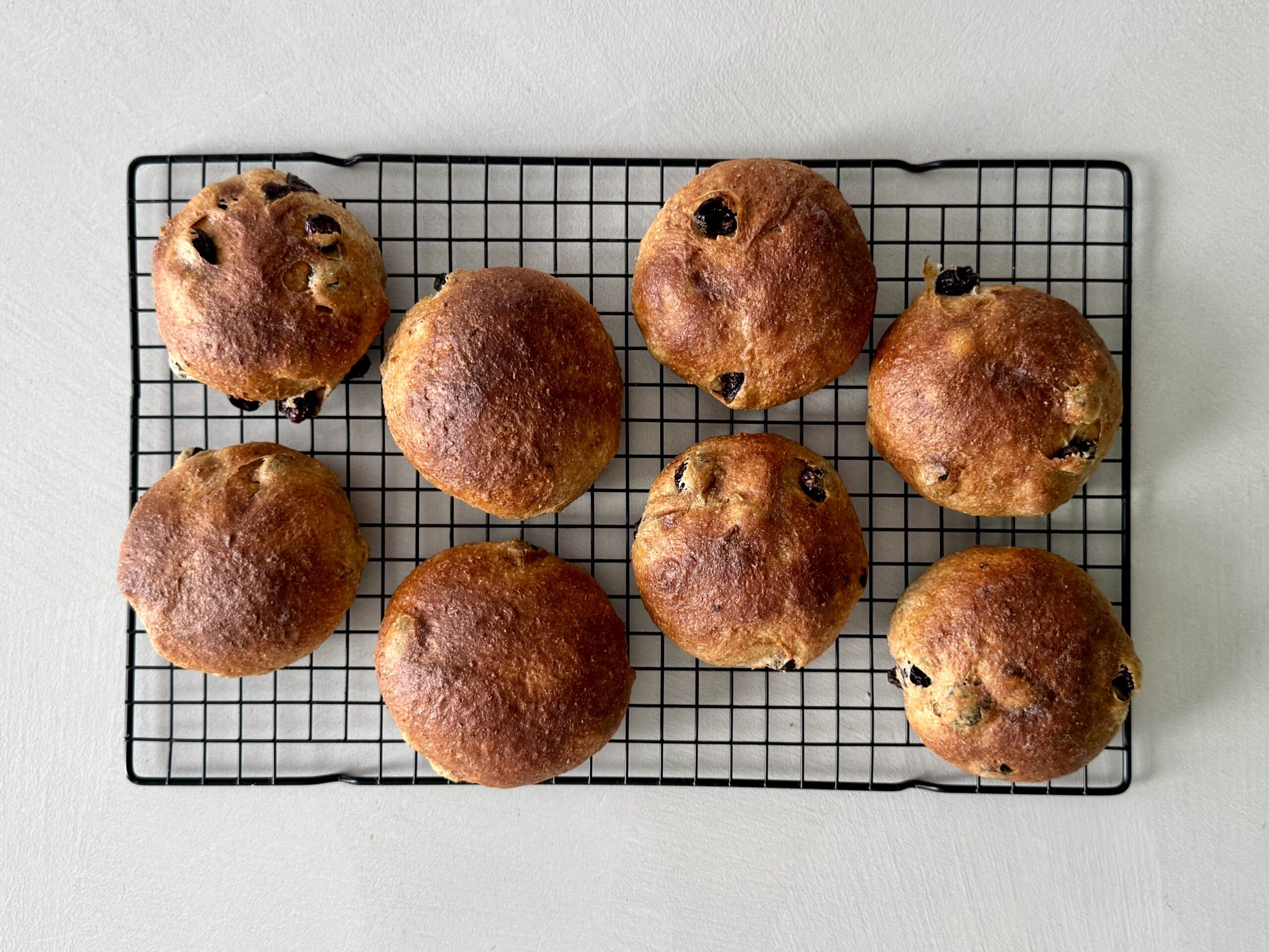 Volkoren rozijnenbollen met zuurdesem discard (8 stuks)